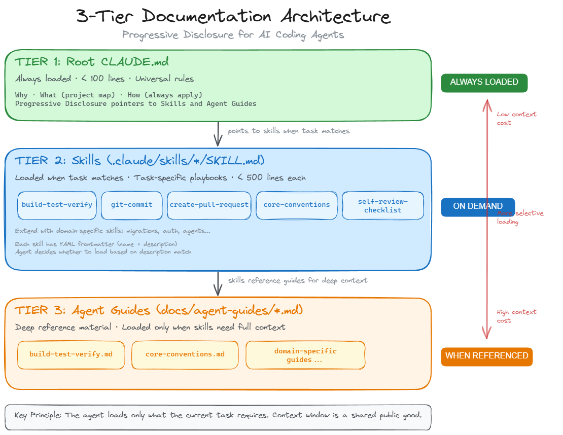 Tier 3: Agent Guides (docs/agent-guides/name.md) - Deep reference material. Build commands, architecture docs, convention details. Skills point to these. The agent reads them only when it needs the full picture.
